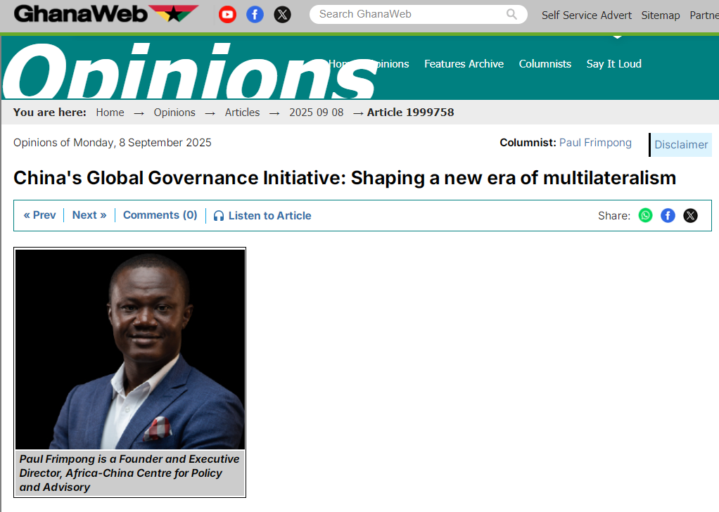 加纳新闻网站“Ghana Web”9月8日刊发加纳非中政策咨询中心执行主任保罗·弗林蓬的署名文章《中国全球治理倡议:塑造多边主义新时代》,对中国提出的全球治理倡议予以高度评价。